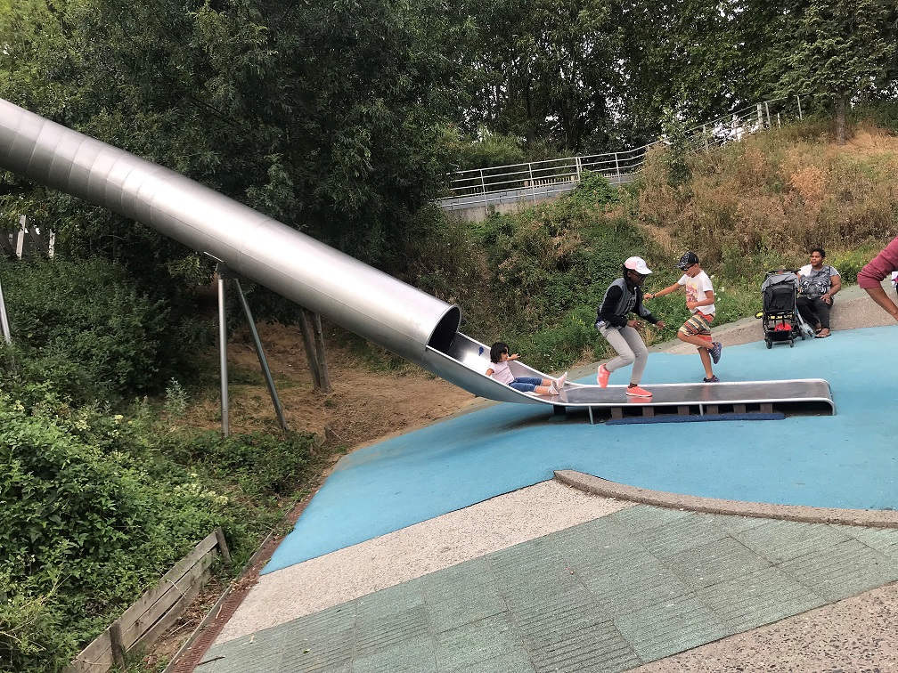 Yukarıdaki fotoğraflar Villet parkı içindeki açık hava parkından. Bu kaydırak halatlarla tırmanılan bir girişe sahip, tırmandıktan sonra da oldukça uzun ve dik bir kaydıraktan kayılıyor. Siz ise çocukları karşılamak için bir rampadan inip kaydırağın çıkışına gidip bekliyorsunuz. Çocuklar kaybolmasın diye, eşim ve ben kaydırağın girişinde ve çıkışında olmak üzere 2 ayrı yerde bekledik mecburen:) Çocuklar bayıldı bu kaydırağa.